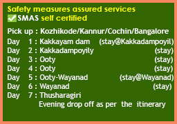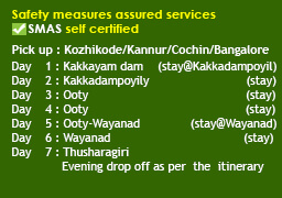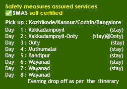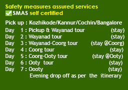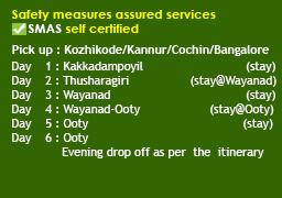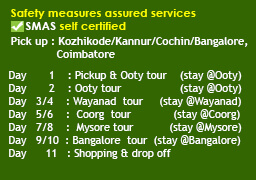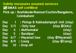North Kerala-Thamilnadu-Karnataka (1n Kakkadampoyil, 2n Ooty, 1n Muthumalai, 1n Bandipur, 2n Wayanad, 2n Coorg)